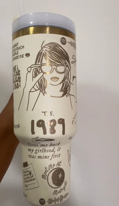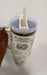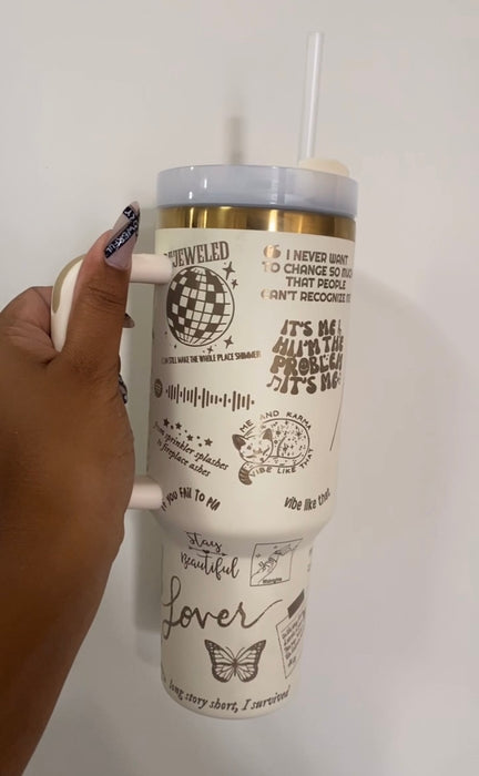 Cream colour engraved Taylor tumbler with clear straw, holds 40oz.
