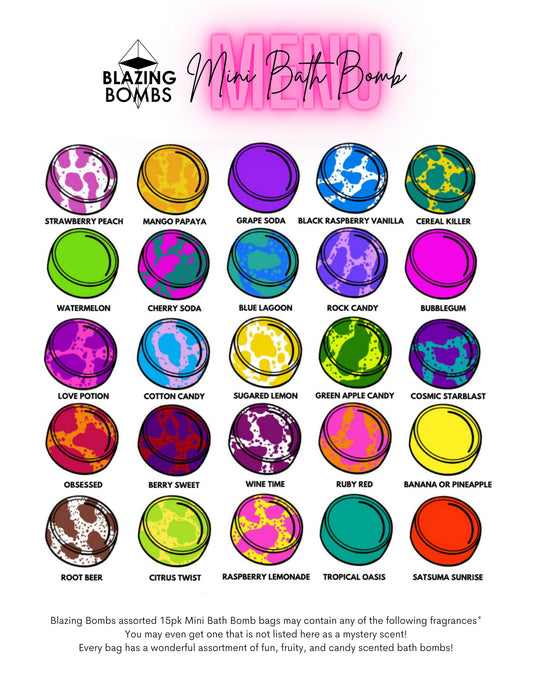 A pre-packed assortment of 15 colourful mini bath bombs! Perfect for gift-giving, kids, quick baths, foot soaks, or sampling. The scents are lush and unique! A mixture of fruit and candy scented aromas!