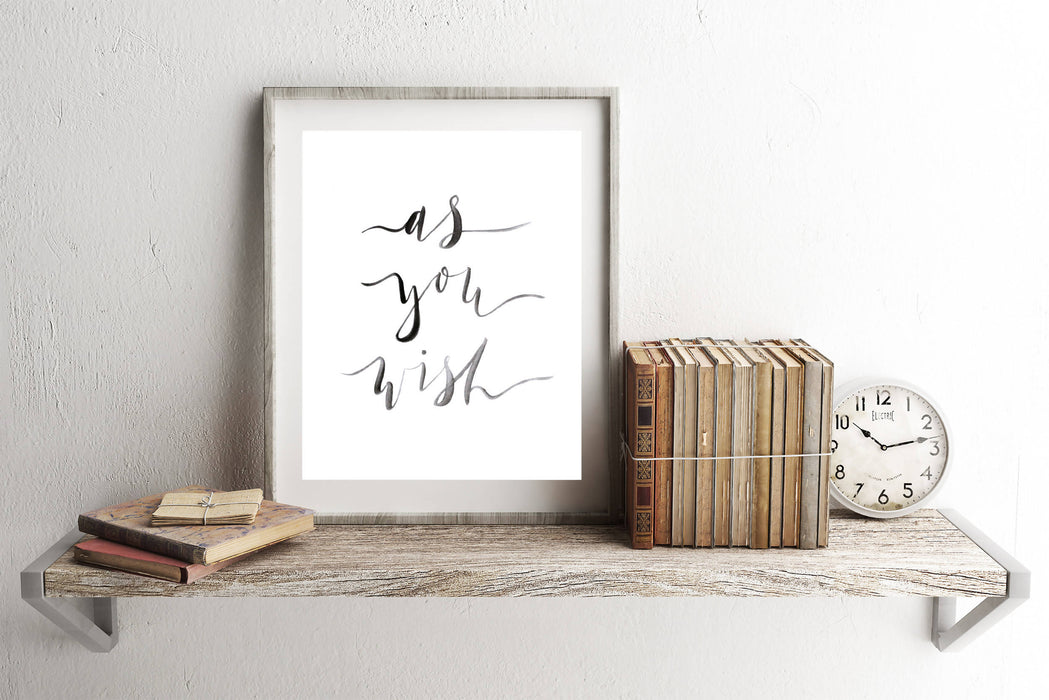 This print is a hand lettered and painted quote from The Princess Bride which reads "AS YOU WISH" in black watercolour. Perfect to hang in your home or to gift to a friend!