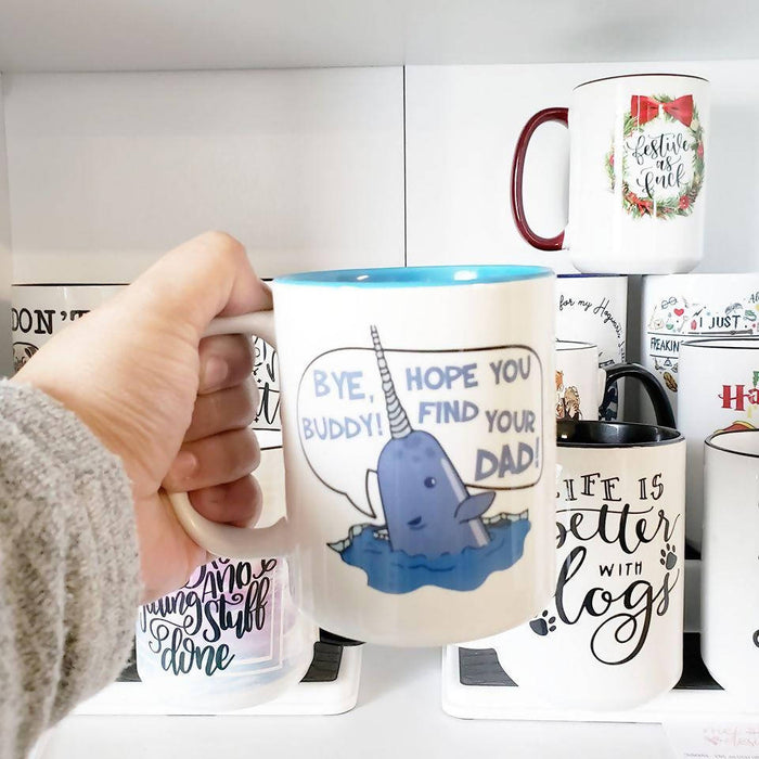 Mugs are 15oz made with permanent ink and are microwave and dishwasher safe!